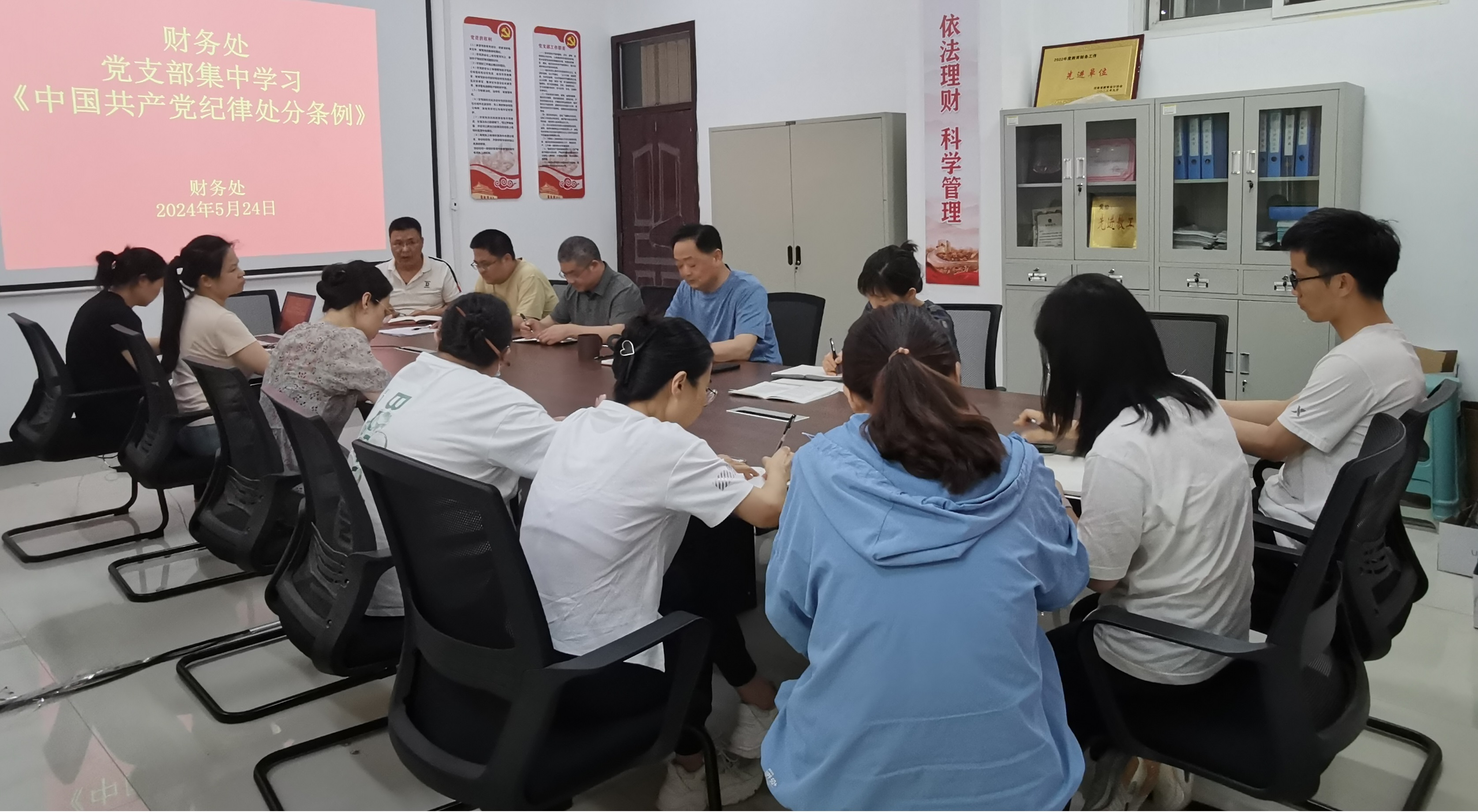 2024年5月24日下午,财务处党支部集中学习《中国共产党纪律处分条例》,本次学习由财务处副处长彭水霞同志领学。学习内容为:对违反组织纪律行为的处分。